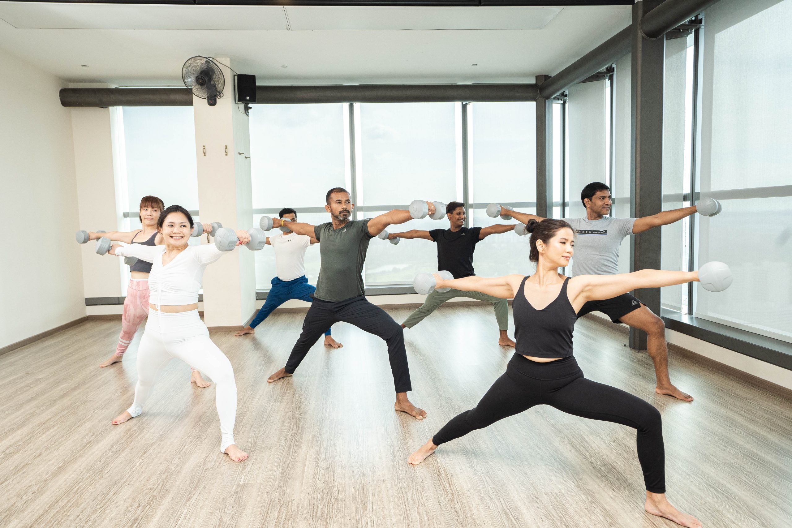 The use of dumbbells in yoga poses challenges your balance and stability, engaging your core muscles more effectively. This can improve your overall body stability and posture.